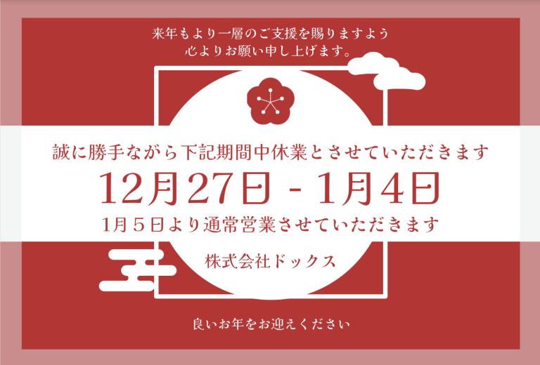拝啓 師走の候、ますますご健勝のこととお喜び申し上げます。 平素は格別のご高配を賜り、厚くお礼申し上げます。 さて、株式会社ドックスでは年末年始の休業日につきまして、下記のとおり休業日とさせていただきます。 皆様には大変ご迷惑をおかけいたしますが、ご了承いただきますようお願い申し上げます。 敬具 記 ■年末年始休業日 2025年12月27日(土)~2026年01月04日(日) ※2026年01月0 […]